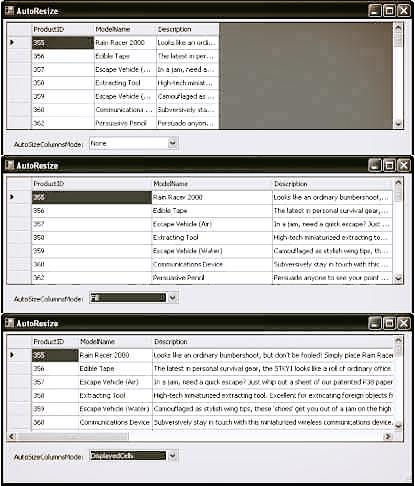 AutoSizeColumnsMode를 언제든지 설정하면 DataGridView가 즉시 열 크기를 조정하도록 트리거됩니다. 그림 15-6은 그리드를 AutoSizeColumnsMode.None에서 AutoSizeColumnsMode.Fill로 변경 한 다음 AutoSizeColumnsMode.DisplayCells로 변경하는 간단한 테스트 애플리케이션을 보여줍니다 (이 경우 마지막 열이 그리드에 맞지 않고 스크롤 막대가 추가됨). ).