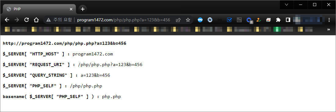 예를 들어 URL이 http://program1472.com/php/php.php?a=123&b=456라고 할 때, 결과는 다음과 같다.
