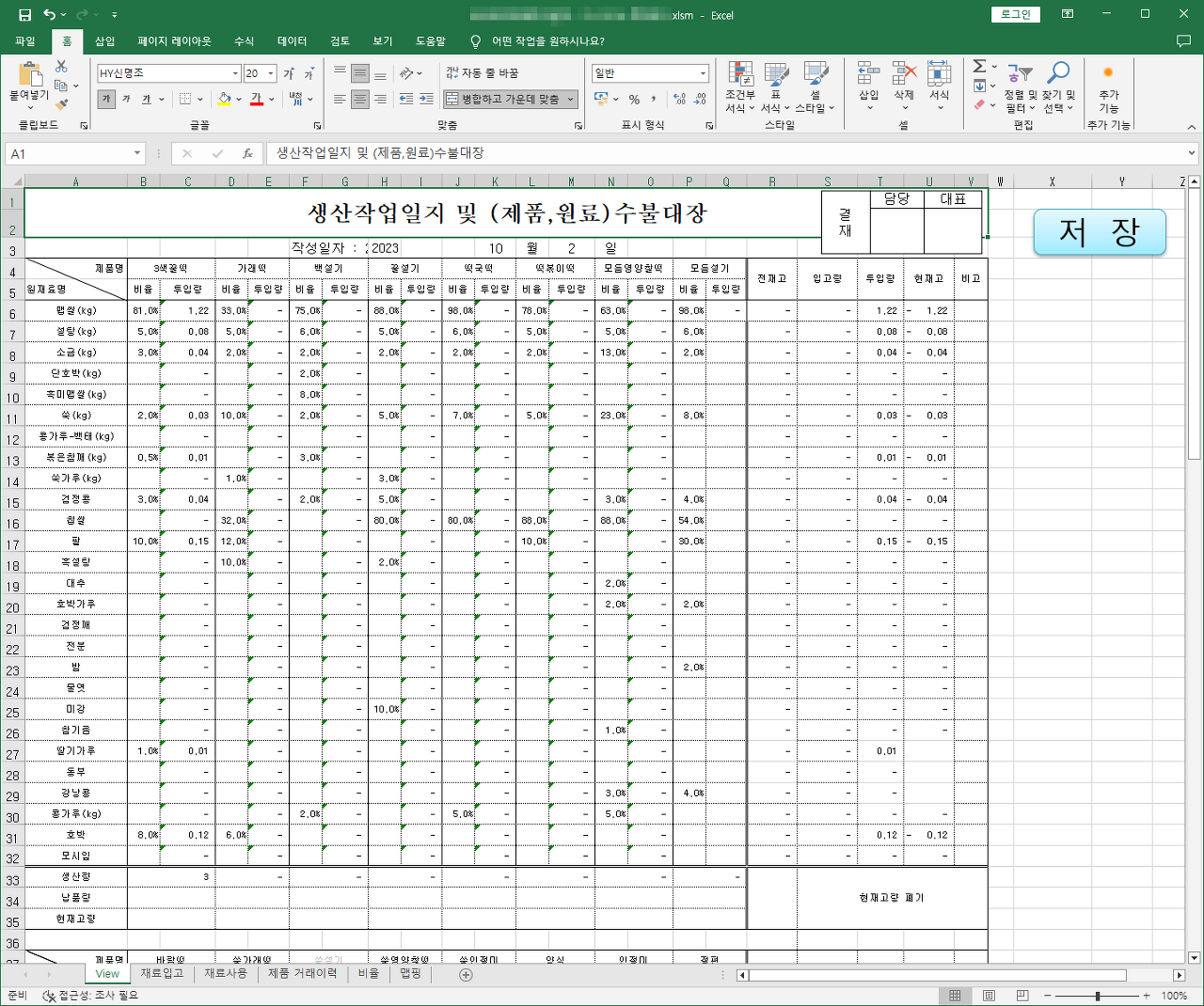 2). 제품 거래 이력 시트에 생산량 또는 출고량을 기입합니다.