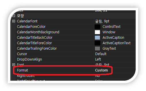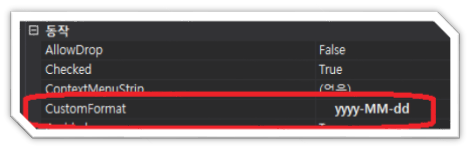다음으로 "동작"에서 "CustomFormat"을 보여질 형식으로 지정합니다.